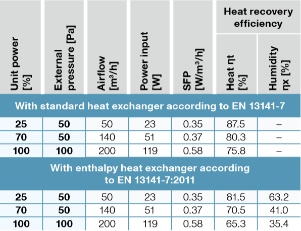 Electrical input (without preheating) | 119 W / 200 m³/h; 51 W / 140 m³/h; 23 W / 50 m³/h |